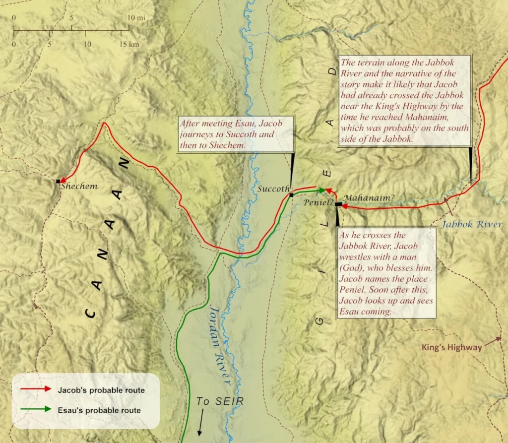 This map shows possible routes that Jacob and Esau may have taken to their meeting place east of the Jordan where they were reconciled after a 20-year estrangement. Also on the map is a potential location for Penuel where Jacob wrestled with God.