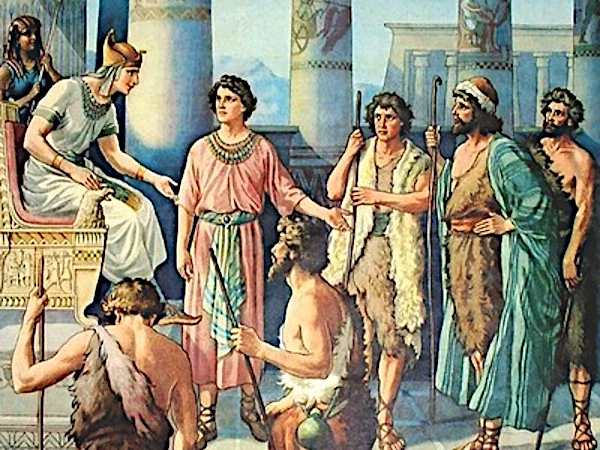 The famine foretold in Pharaoh’s dreams began to affect Jacob’s family in Canaan. Hearing that grain was available in Egypt, Jacob sent his ten eldest sons there to buy food. Like all the Egyptians, Joseph’s brothers had to deal with Joseph to obtain the grain. When they came to him, Joseph recognized them but they didn’t recognize him. He provided them with the grain they needed, but told them they should not return unless they brought his younger brother Benjamin with them. Joseph sent them back to Canaan, but held Simeon as a hostage to secure their promise to return with Benjamin.